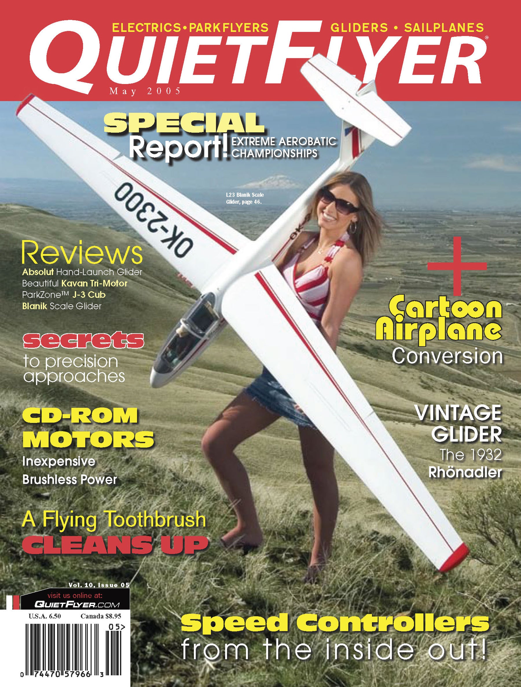 Quiet Flyer May 2005 issue includes: Leading Edge; Hot Products; Event: Memphis Indoor; Feature: CD-ROM Motors, Flying Toothbrush; Conversion: Mudd Duck; Columns: Power On, Simply Soaring, Power Scale Scene, Sport Electrics, Demystifying Electrics, Hop Up, Parkside, Scale Gliders & Reviews: J3-Cub, L23 Blanik, Ford Tri-Motor, Adsolut, DVDS