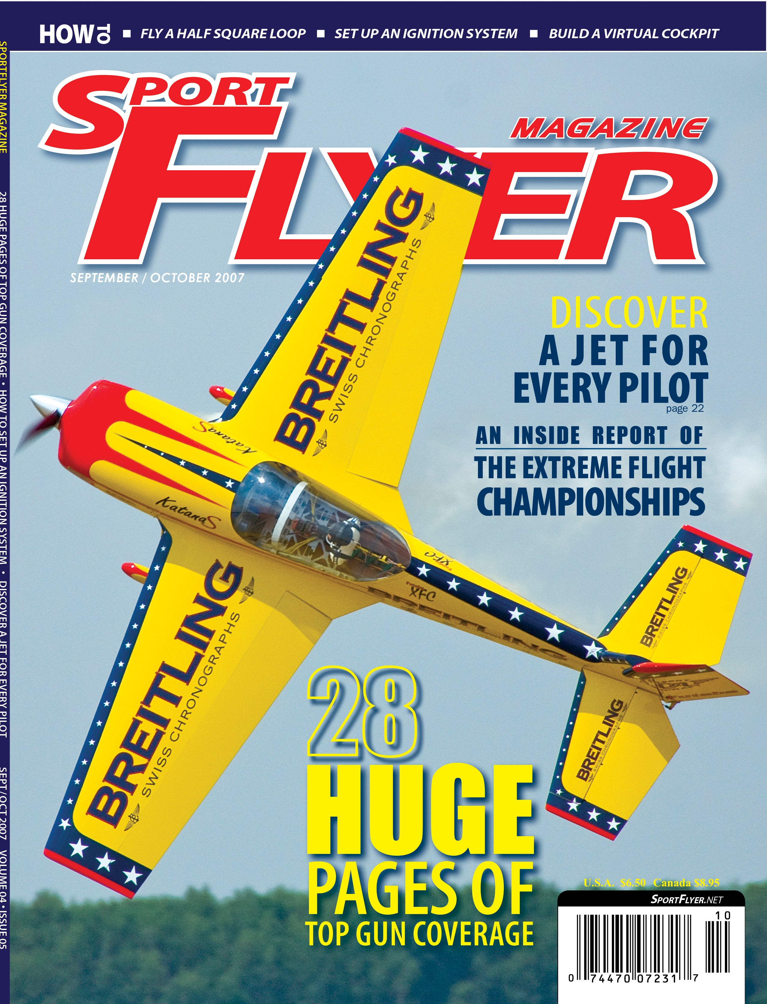 RC Sport Flyer September/October 2007 (formerly 3D Flyer) issue includes: Leading Edge; Events: Futaba XFC Competition, Top Gun; Features: Composite ARF Lightning; Columns: RealFlight Part III, Amped Up, Scale Hangar; How to: Ignition Systems, Half Square Loop, Virtual Cockpit, Proper Engine Selection; Reviews: Twist 150 ARF, Seagull Models Bling 3D, Super Star ARF.