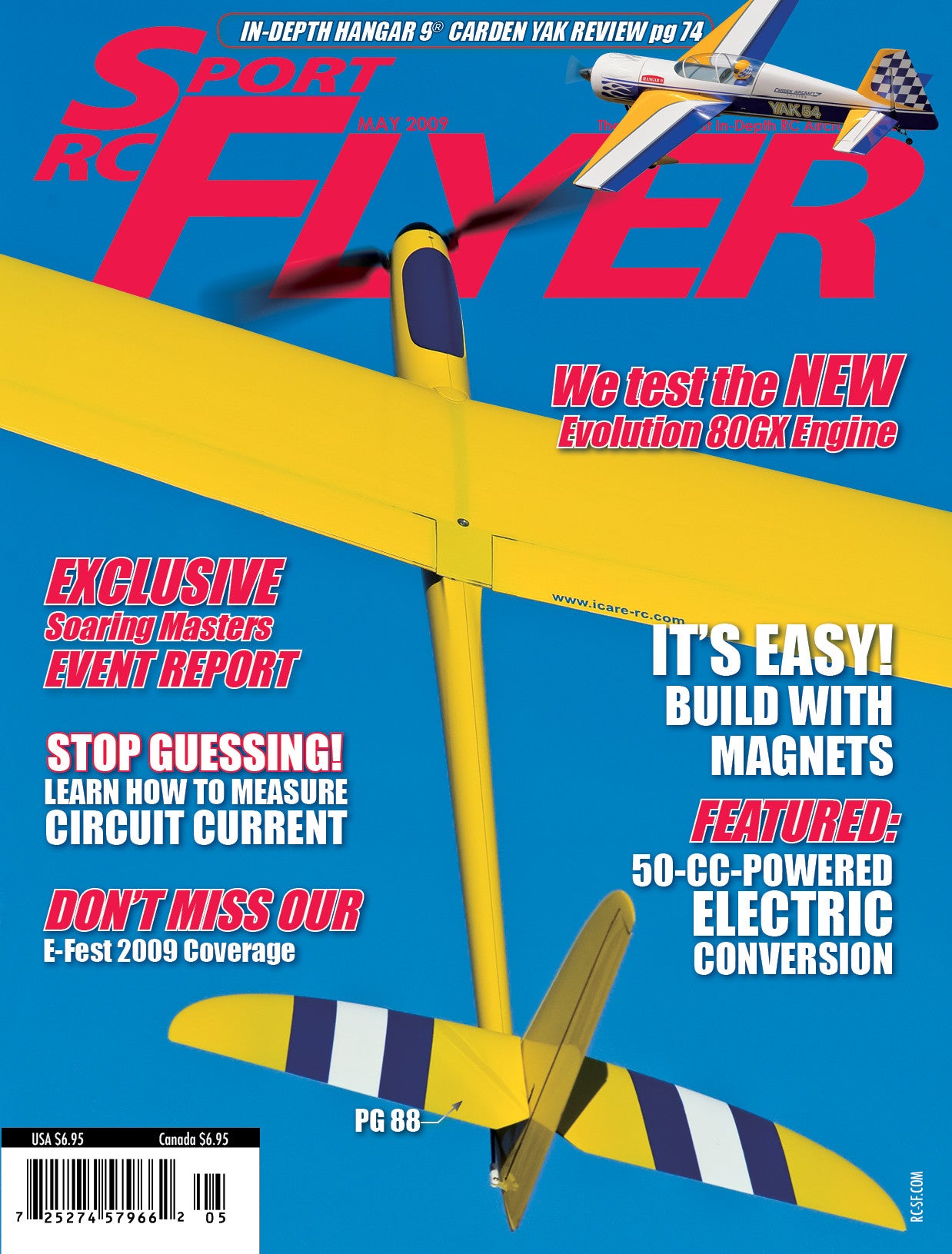 RC Sport Flyer's May 2009 issue includes: Leading Edge; How to: Measure Circuit Current, Model Rack; World Soaring Masters; Columns: Evolution 80GX Engine Test, 50-cc Hop Up, Building Airframes, E-Fest '09, Heli-Max AXE 400 RTF test, Flying and Building; Reviews: Hangar 9 Yak 54 ARF, Gladiator G2-E; plus Mystery Plane contest.