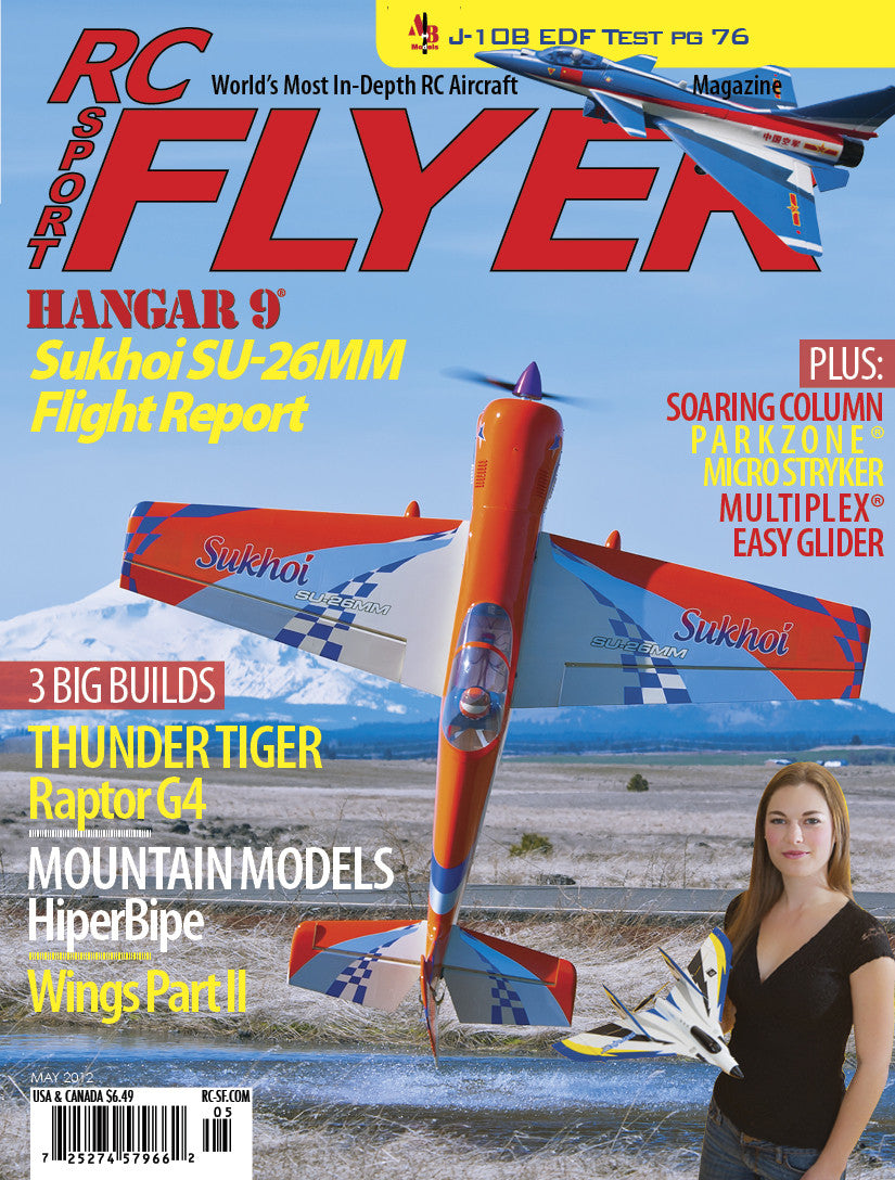 RC Sport Flyer's May 2012 issue includes: Leading Edge; Hot Products; Build: Wings Part-2, Sorrel SNS-7 HiperBipe, Thunder Tiger Raptor; Photos: PAU 35% Extra 300; Column: Fox Glider Soaring, AeroTow Glider; Reviews: Parkzone Spitfire, The Wing Maker J-10B EDF, Parkzone F-27 Stryker; plus Mystery Plane contest.