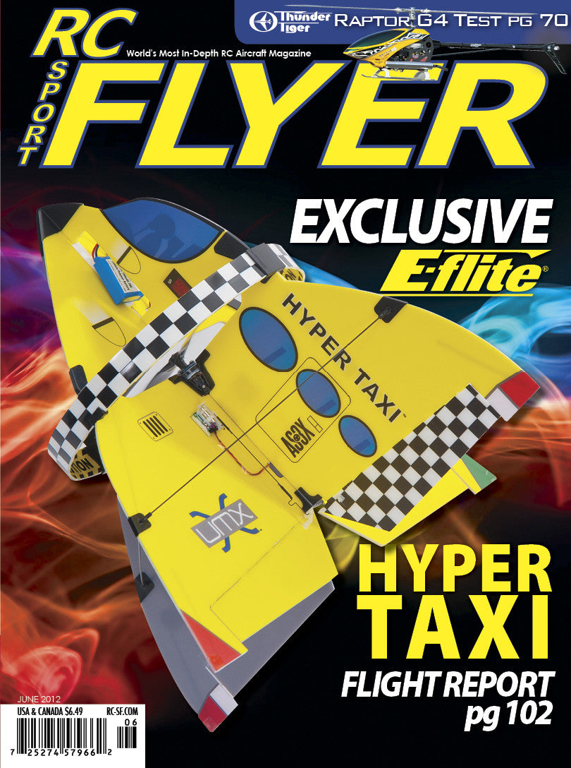 RC Sport Flyer's June 2012 issue includes: Leading Edge; Hot Products; Test: O.S. Engines GT33; Build: Wings Part-3; Feature: RES Gliders; Column: How to take Spoilers Apart; Reviews: TT Raptor G4, AeroWorks 260, Thunder Power 1430C Charger, and E-flite Beast, Gee Bee, Sbach, Hyper Taxi; plus Mystery Plane contest.