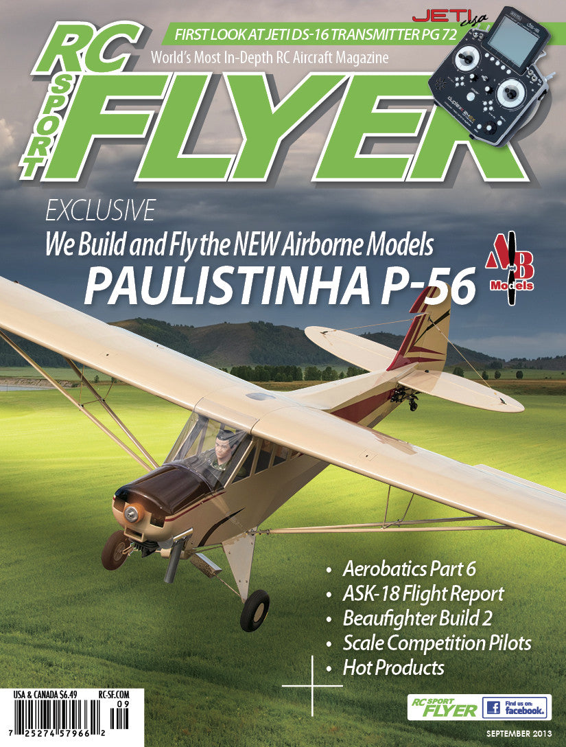 RC Sport Flyer's September 2013 issue includes: Leading Edge, Hot Products; Build: Bristol Beaufighter-2, Flying an ASK-18 Glider, Preparation for Covering, Scale Competitors-2; How to: Aerobatics-6; Reviews: Tamecat 40 ARF, Jeti DS-16, 50CC Paulistinha; plus Mystery Plane contest.