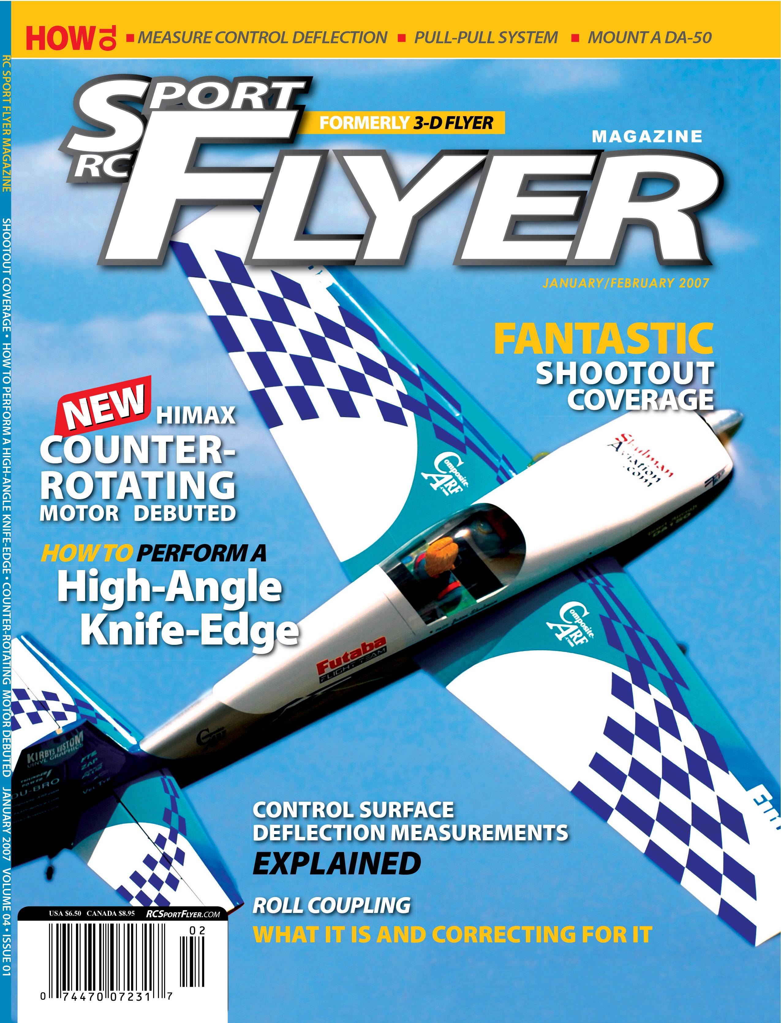 RC Sport Flyer January/Febuary 2007 (formerly 3D Flyer) issue includes: Leading Edge; Event: Tucson Shootout 2006, Don Low Masters 2006; Feature: Roll Coupling; How to: Measure Deflection, High-Angle Knife-Edge, Mount DA-50 Engine, Pull-Pull System; Motor Test: Evolution GT26 engine; Columns: Using a computer radio Part IV, Aeros & Patterns, Amped Up, Rototalk; Product Look: Maxx Counter-Rotator, Hahn's Gas Can; Reviews: Airwild Extra 260; Hot Products.